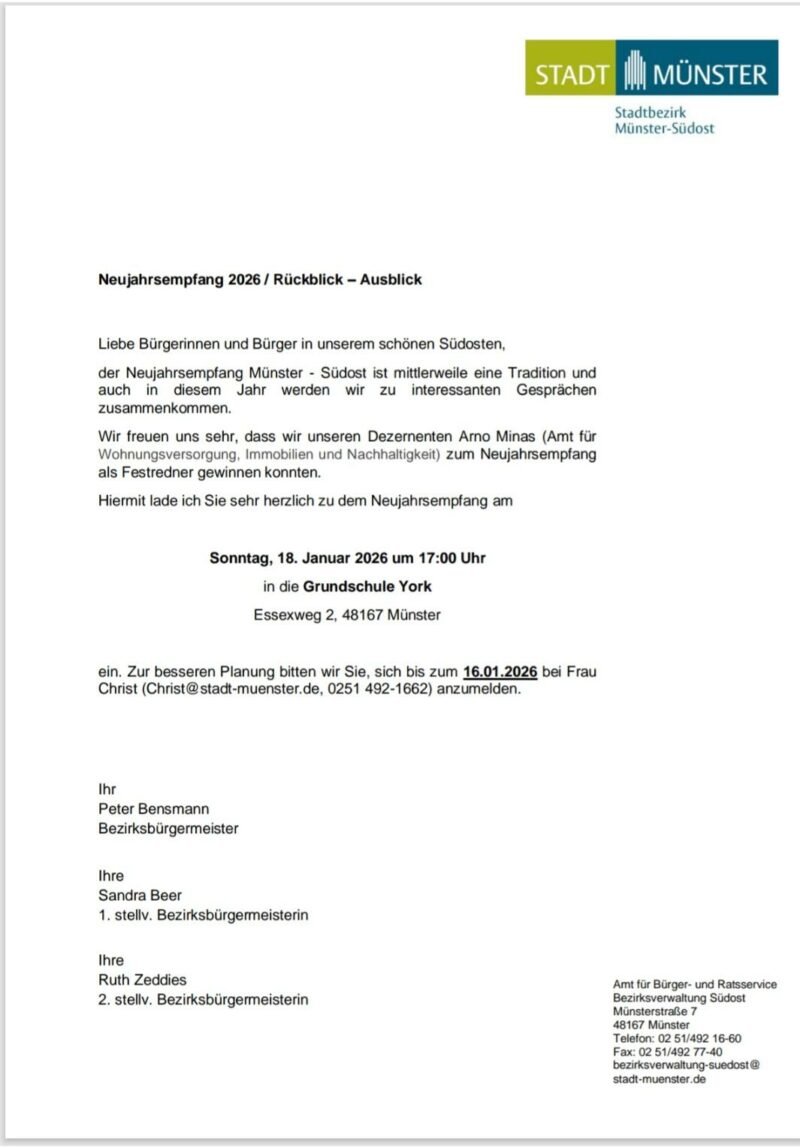 Die neu gewählte Bezirksvertretung Südost lädt am Sonntag den 18. Januar um 17 Uhr zu einem Neujahrsempfang in die ebenfalls neue Grundschule York ein. Hier ist das offizielle Einladungsschreiben: